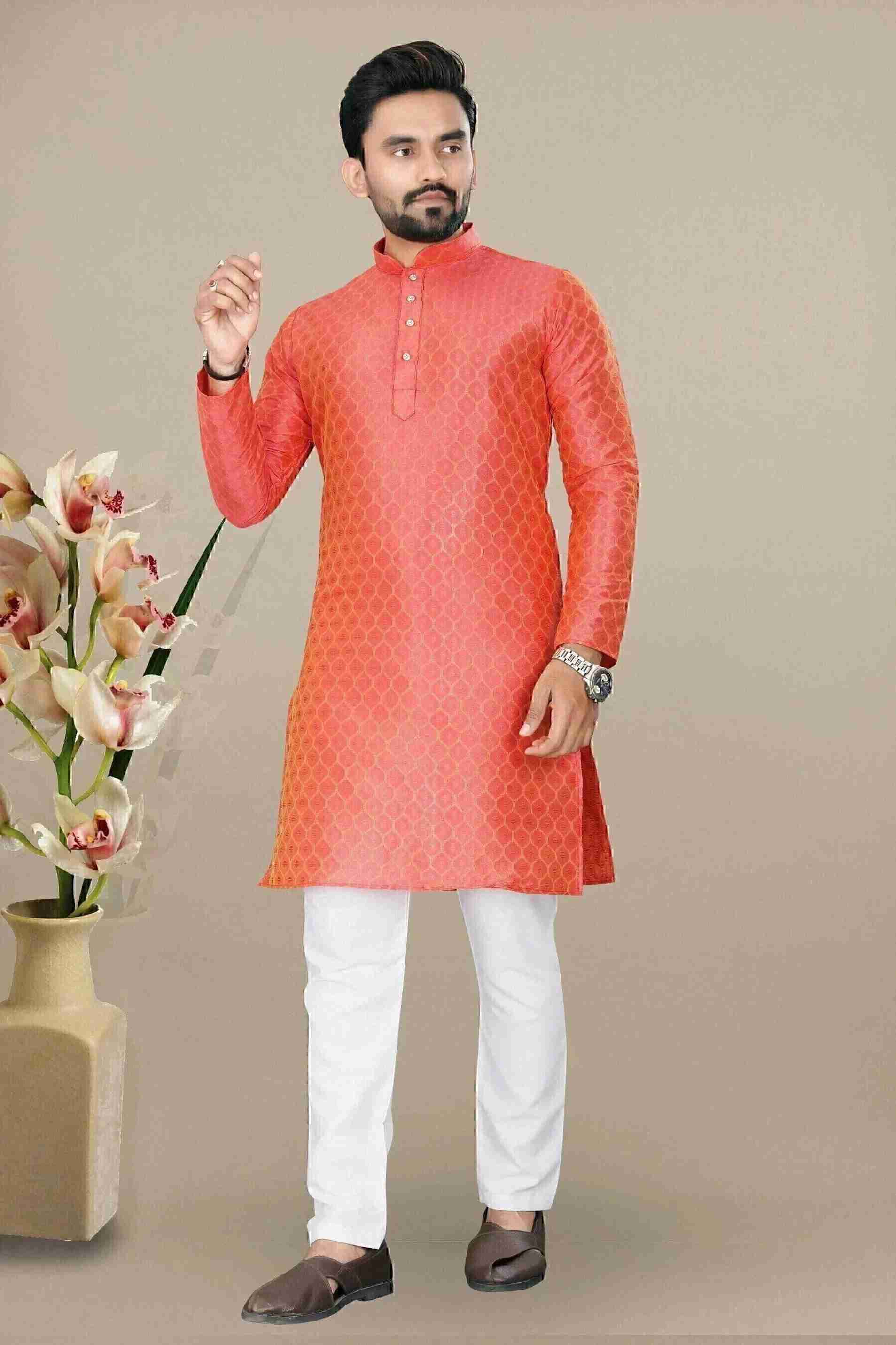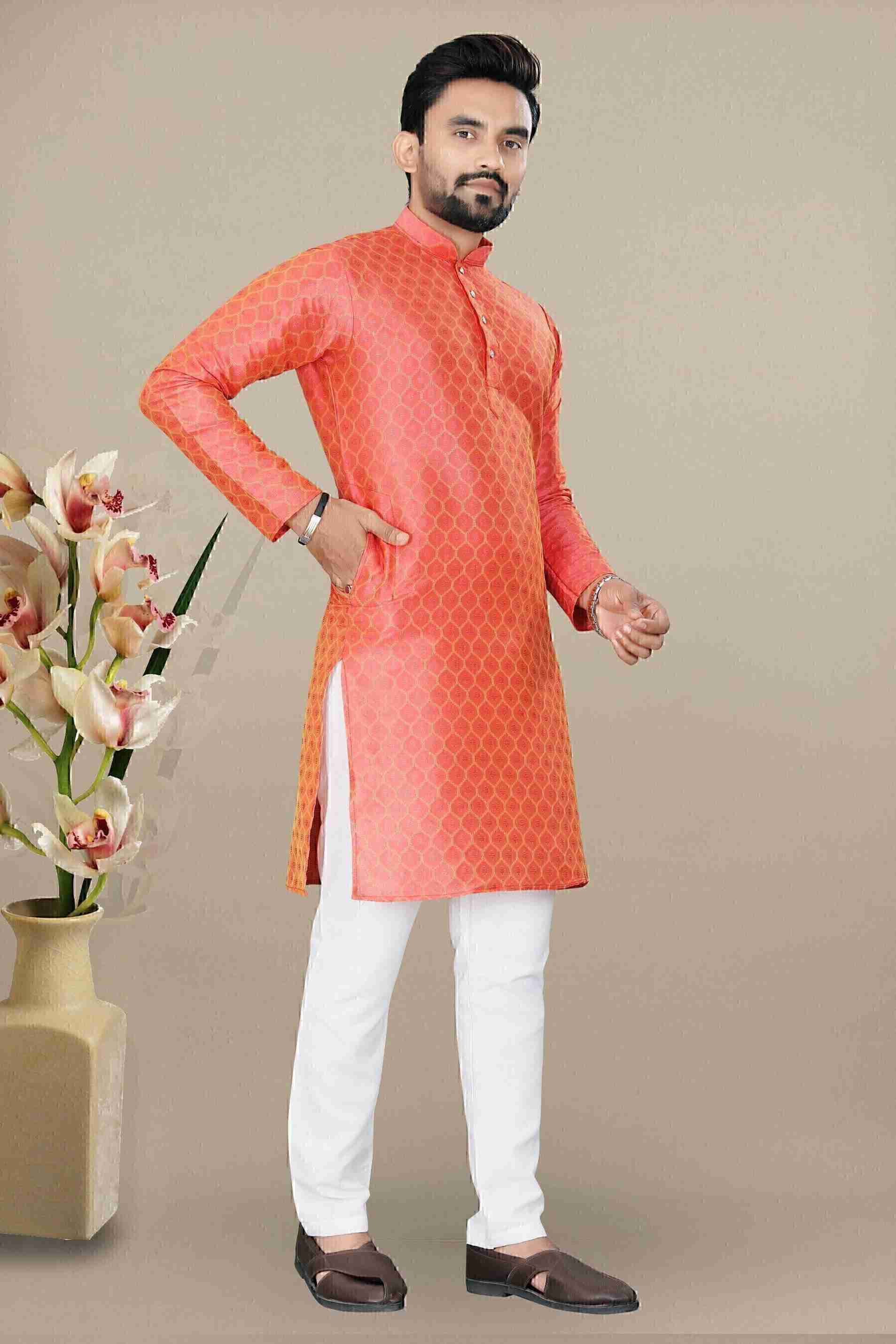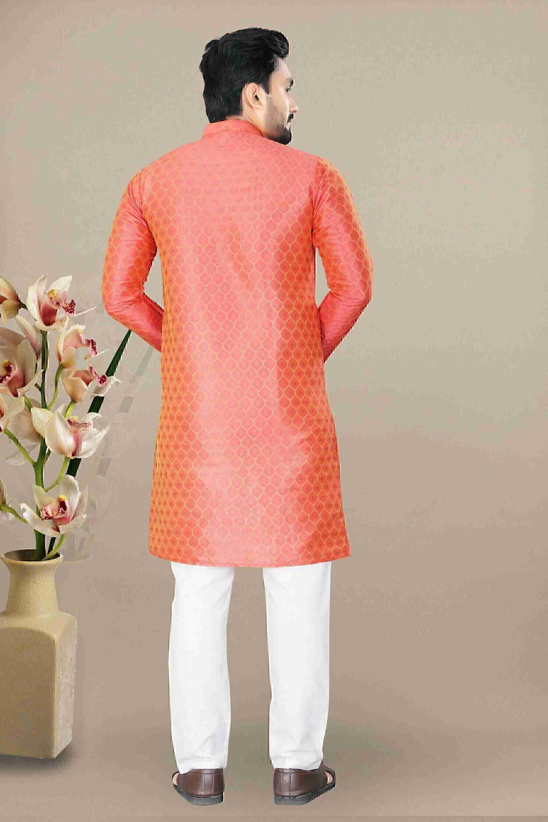 This knee-length men's kurta and pyjama set feature a striking printed pattern that adds a touch of sophistication to your wedding attire.