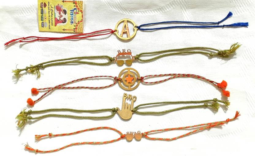 Manuskript by MNK Designer Cool Bro Rakhis - pack of 5 Mauli Thread Rakhi Set (15 rakhis, 1 Tikka, Roli, Chandan & mishri packet, 1 envelope)