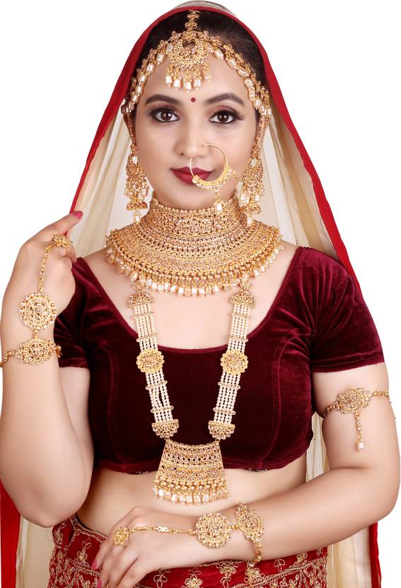 ट्रेडिशनल कुंदन दुल्हन सेट / ब्राइडल सेट वेडिंग ज्वैलरी। हाई क्वालिटी वाले ट्रेडिशनल ब्राइडल ज्वेलरी कॉम्बो नेकलेस सेट आपकी सुंदरता को बढ़ाने और आपकी शादी के दिन आपकी तारीफ करने के लिए सबसे अच्छा सामान है। दुल्हन सेट / ब्राइडल सेट ज्वैलरी फुल सेट इस सेट में 1 नेकलेस, 1 लॉन्ग नेकलेस, 1 माथा पट्टी, 1 ईयरिंग्स का पेयर, 1 जोड़ी हाथ पंजा, 1 बैजुबांध और 1 नोज रिंग शामिल हैं