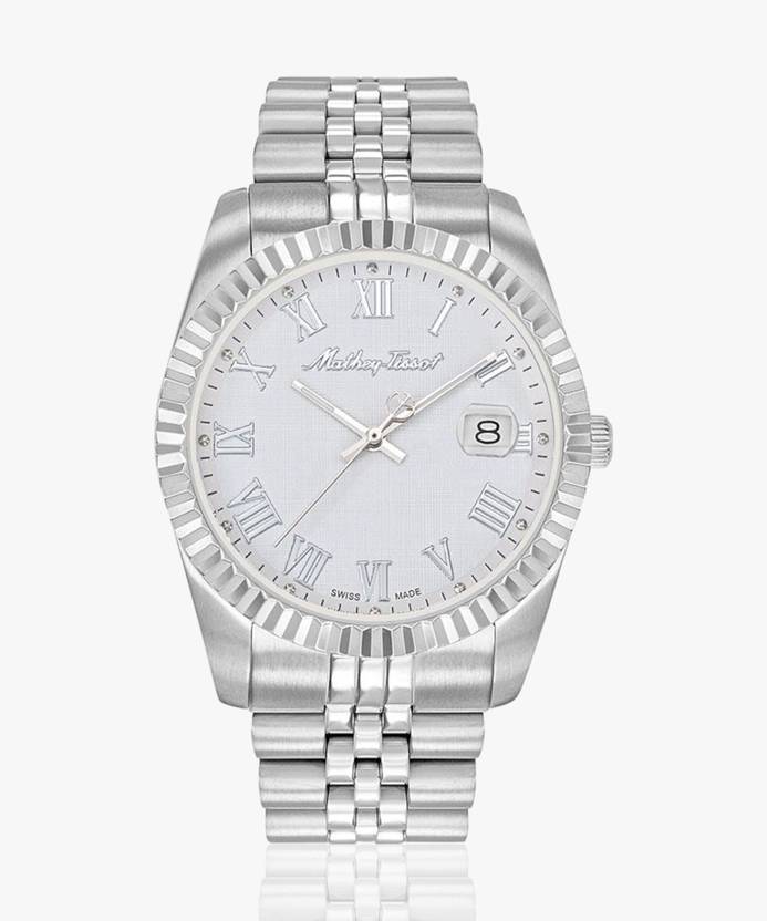 Silver-tone stainless steel case and bracelet. Fixed silver-tone stainless steel bezel. White dial with silver-tone hands and Roman numeral hour markers. Minute markers around the outer rim. Dial Type: Analog. Luminescent hands. Date display at the 3 o'clock position. Ronda Caliber 515 quartz movement. Scratch resistant mineral crystal. Pull / push crown. Solid case back. Round case shape, case size: 40 mm. Fold over clasp with a safety release. Water resistant at 50 meters / 165 feet. Functions: date, hour, minute, second. Mathy IIi Roman Series. Casual watch style. Watch label: Swiss Made. Mathey-Tissot Mathy III Roman White Dial Unisex Watch H810ABR.
