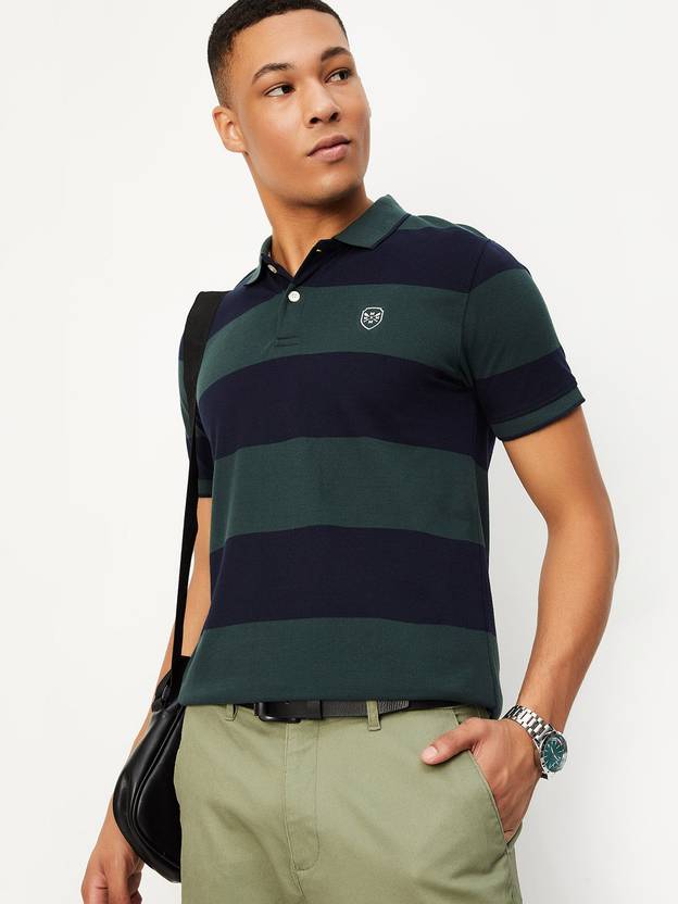 MAX Striped Men Polo Neck Green T-Shirt