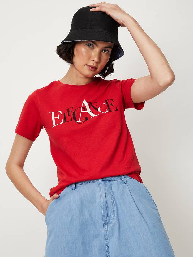 मैक्स महिलाओं के लिए गोल गला टाइपोग्राफी लाल टी-शर्ट