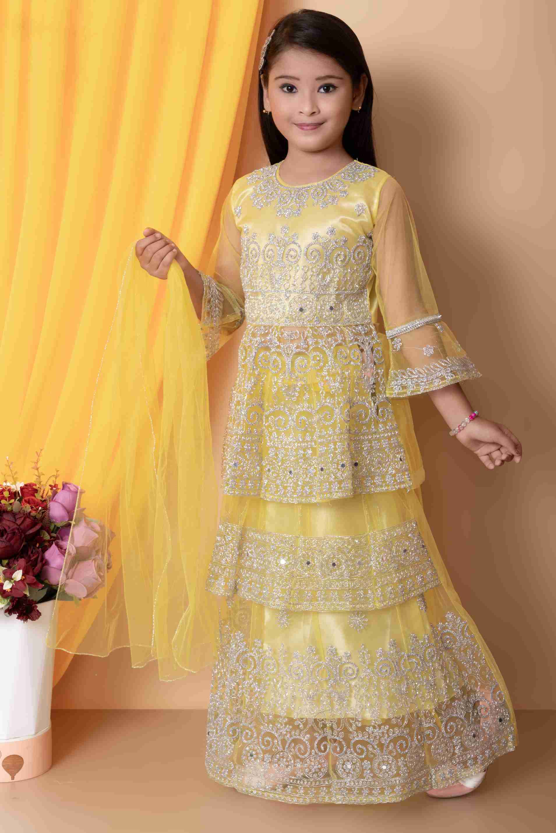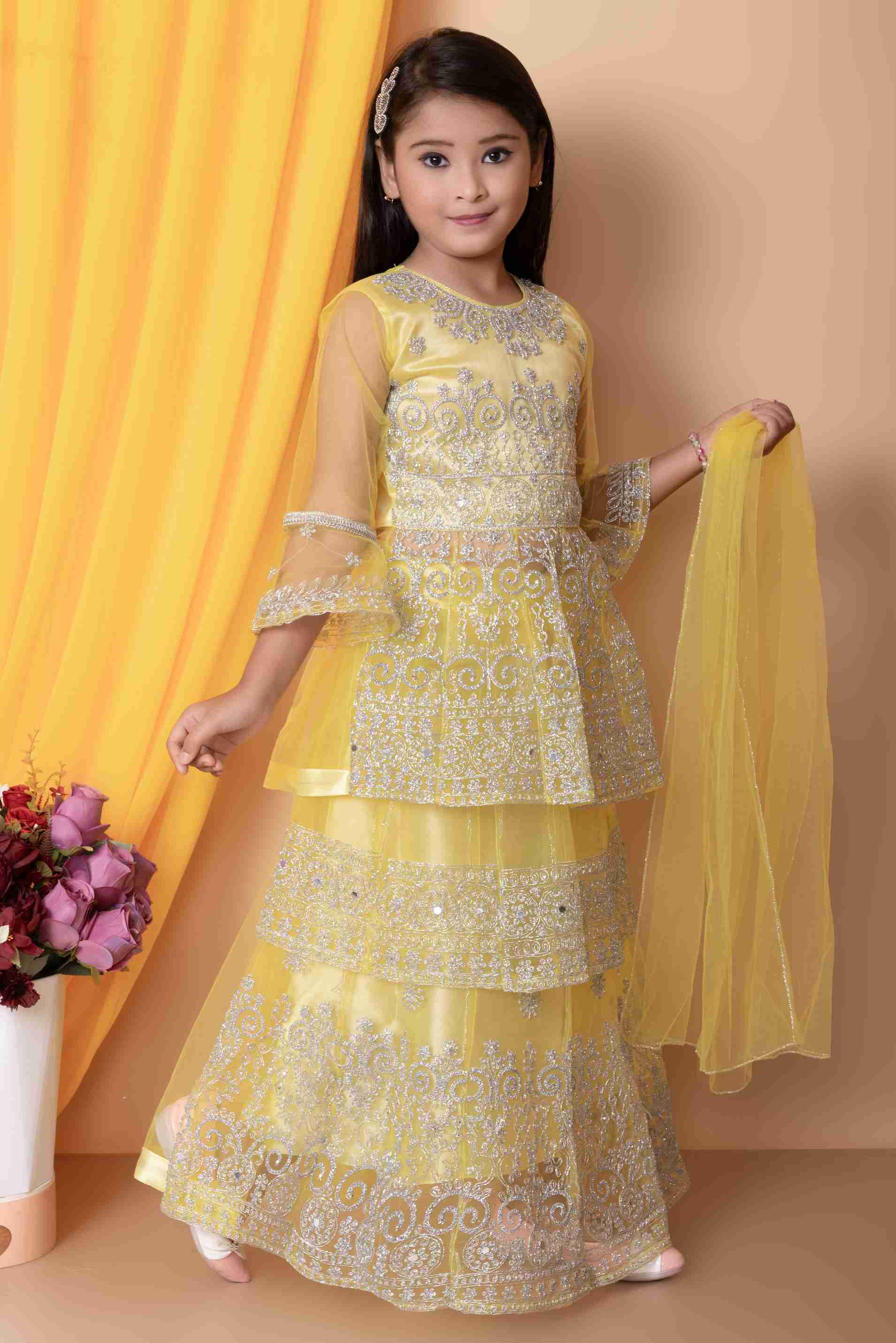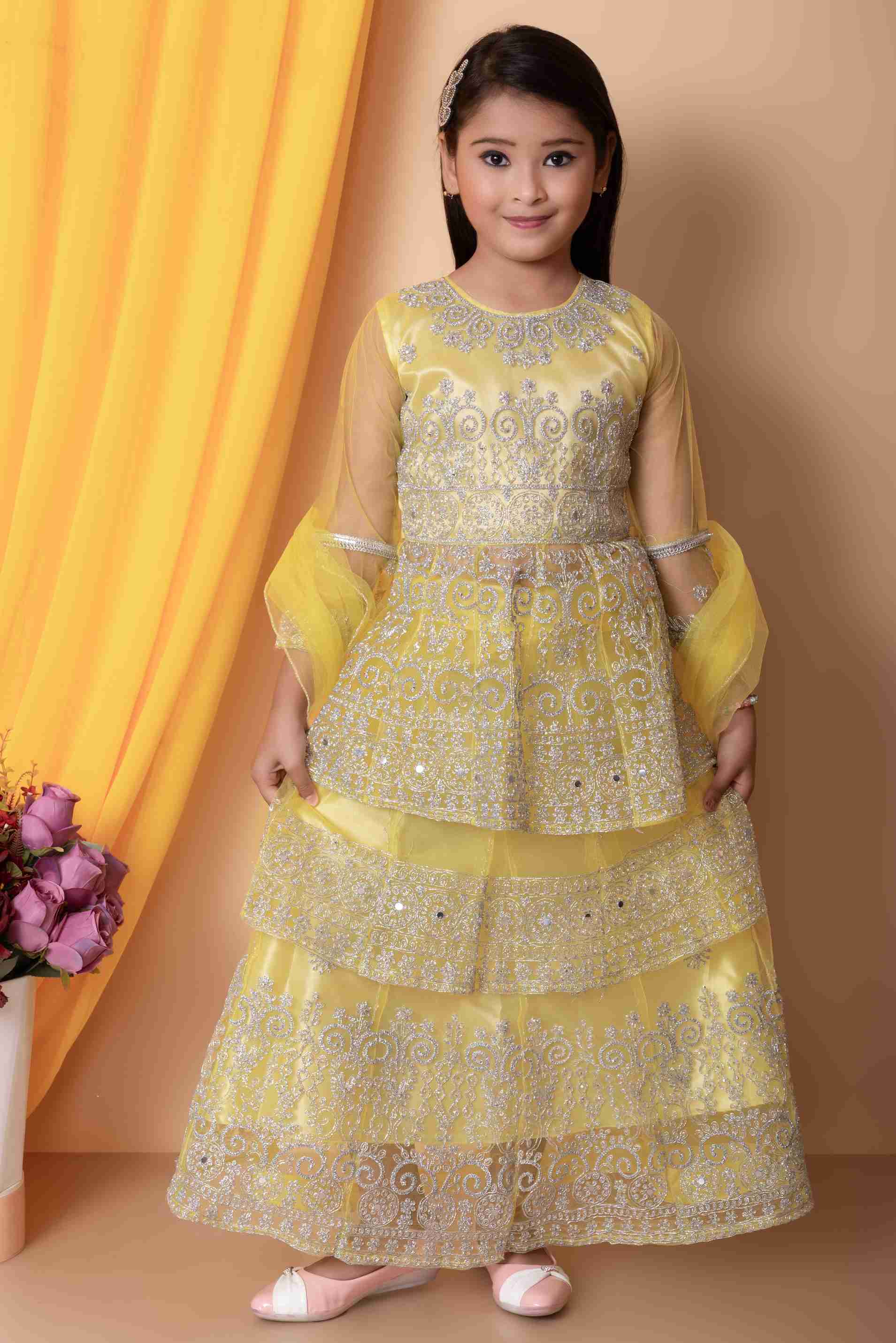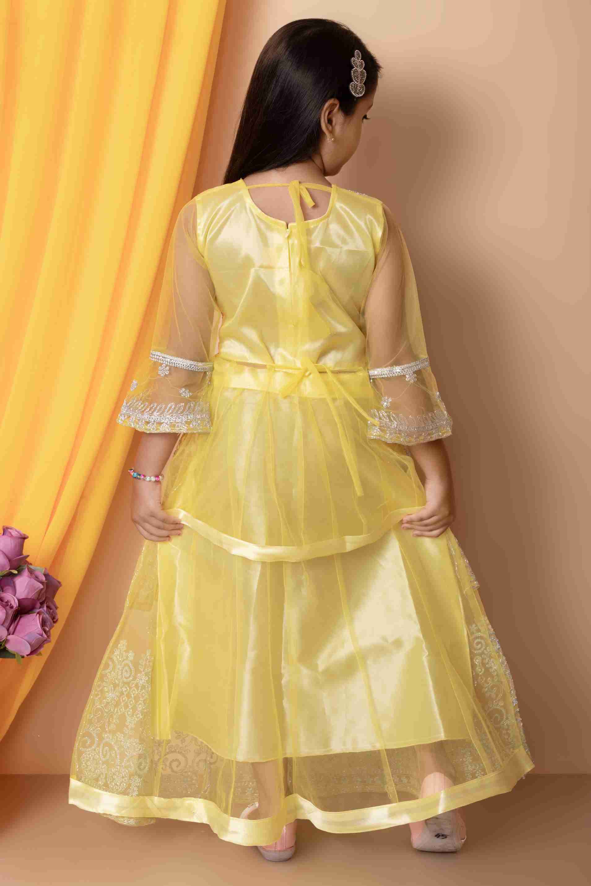 Indi लड़कियों के लिए लेहंगा चोली एथनिक वियर, पार्टी वियर एम्ब्रॉइडर्ड लेहंगा, चोली और दुपट्टा सेट (पीला, 1 का पैक)