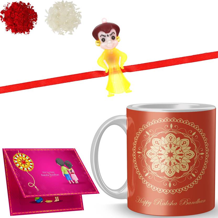 VRANTIKA Thread Rakhi with mug_5821 Gold Finish Rakhi, Chawal Roli Pack, Greeting Card, Mug Set (1 Rakhi, 1 Mug, 1 Roli & Chawal, 1 Card)