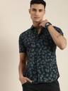 नेवी ब्लू फ्लोरल प्रिंटेड ओपेक कैजुअल शर्ट, कटअवे कॉलर, बटन प्लैकेट, शॉर्ट रेगुलर स्लीव्स , कर्व्ड हेम है