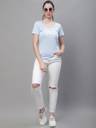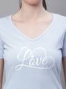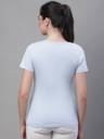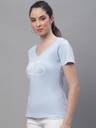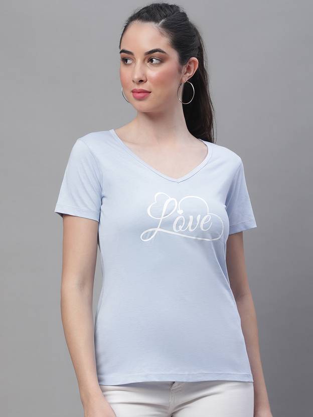 moonaah Women Typography V Neck Cotton Blend Light Blue T-Shirt