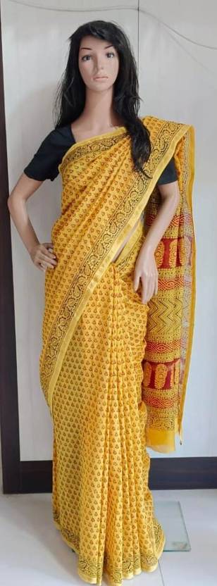 Blocked Printed Chanderi Cotton Silk Saree (Yellow)