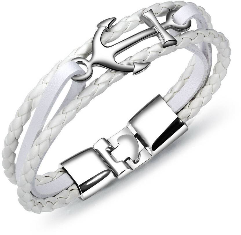 Men's Stainless Steel Anchor White Leather Multi Strap Bracelet