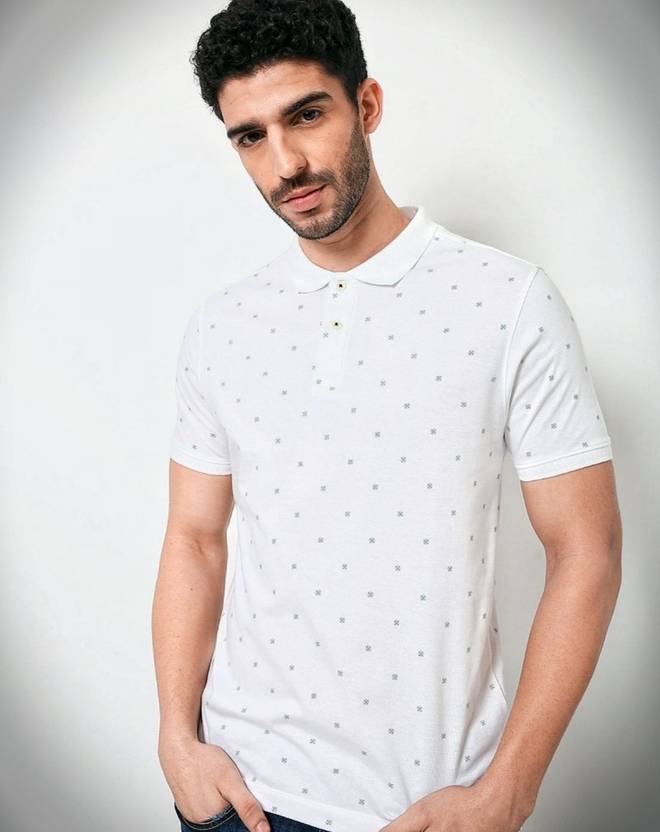 Men Printed Polo Neck Cotton Blend White T-Shirt