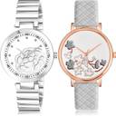 Dial Colour : White ; Band Colour : Silver And Grey ; Case Shape : Round ; Band Material : Metal And Genuine Leather ; Case Diameter : 35 And 34 mm ; NEUTRON Classical Quartz casual flower chain And sparkle flower Silver And Grey Colour Analog Metal And Genuine Leather Belt 2 Watch Combo For Women And Girls - GL319-GM505