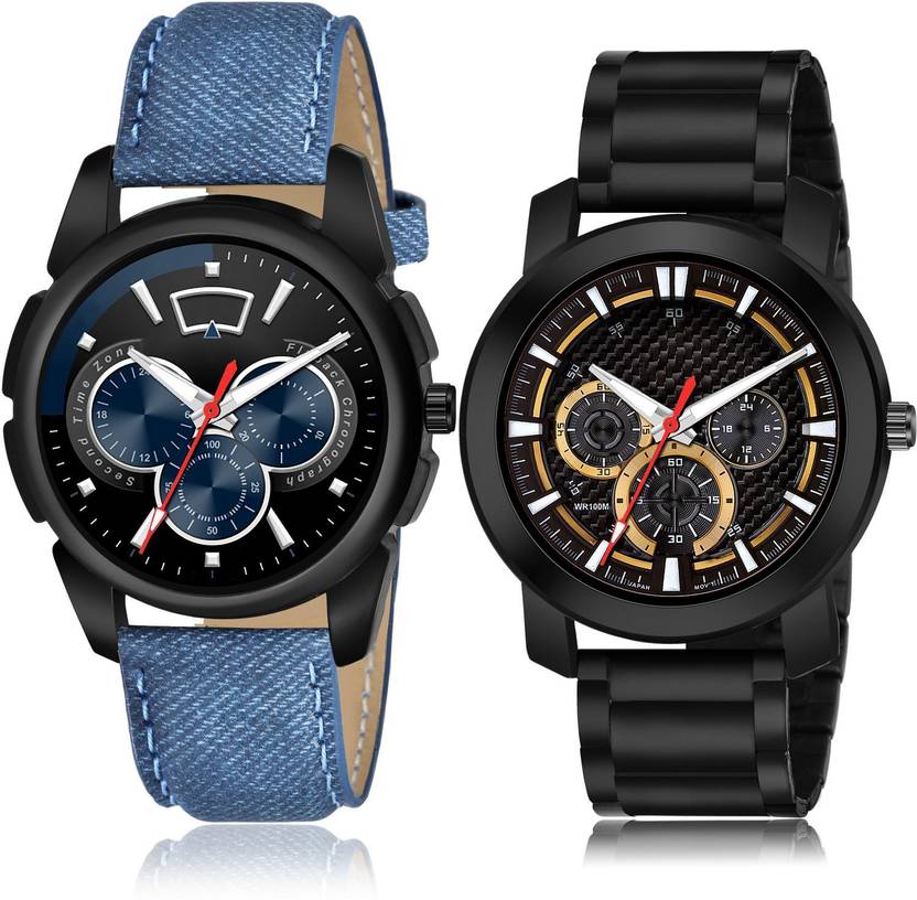 Dial Colour : Black ; Band Colour : Blue And Black ; Case Shape : Round ; Band Material : Genuine Leather And Stainless Steel ; Case Diameter : 43 And 47 mm ; NEUTRON Modish Collection casual and black chain Blue And Black Colour Analog Genuine Leather And Stainless Steel Belt 2 Watch Combo For Boys And Men - S361-(72-S-20)