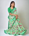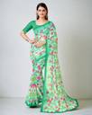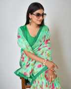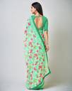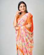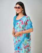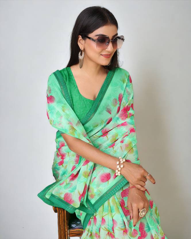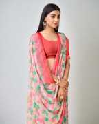 Certainly! You're describing a women's chiffon saree with a floral print and lace embellishments. This type of saree combines the delicate and lightweight nature of chiffon with the beauty of floral patterns and lace detailing. It's a fashionable and elegant choice, often influenced by Bollywood style, making it a popular option for various formal and special occasions. The addition of lace enhances the saree's overall aesthetics, adding a touch of sophistication and grace to the outfit.