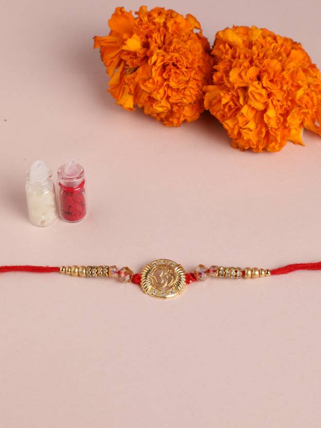 Rakshabandhan is a beautiful festival which is celebrated all over India with lots of joy and happiness. This is the time for a get together celebration with your siblings and close once. Let’s celebrate this unbreakable bond with Niscka Rakhi. This is very classic and elegant 18k gold plated rakhi with design Om pendant. It has small Cz and golden beads on the red thread. Includes- Designer Rakhi, Roli and rice