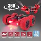 SUPER OFF-ROAD: The durable tires are in concave-convex texture with non-slip design, providing strong friction, enabling this RC stunt car to conquer no matter land, beach, grass, or wetland easily. FULL FUNCTION RC STUNT CAR: Our remote-control car can perform many cool stunts. It can move in all directions, do extreme 360 degree flip on both sides using its controller, bringing unique and endless fun to your kids STRONG POWER: Equipped with powerful motors and 4WD, this stunt car can run at fast speed and do quick turning and rotating action. Applying 2.4Ghz technology, the remote control has a strong anti-interference ability, allowing you to run multiple remote-control toys at the same time. QUALITY MATERIAL: Made of premium ABS plastic, non-toxic and tasteless, this RC car is safe and durable for kids to play with. No more worrying about your naughty kids rough on toys. Kids favorite Christmas gift. TOUGH AND COOL DESIGN - The remote-control car’s remote controller is very convenient to use and allows you to easily switch the steering wheel freely from left to right. Have hours of endless fun with your friends playing with this cool RC Car. With realistic design and many top-class features.