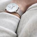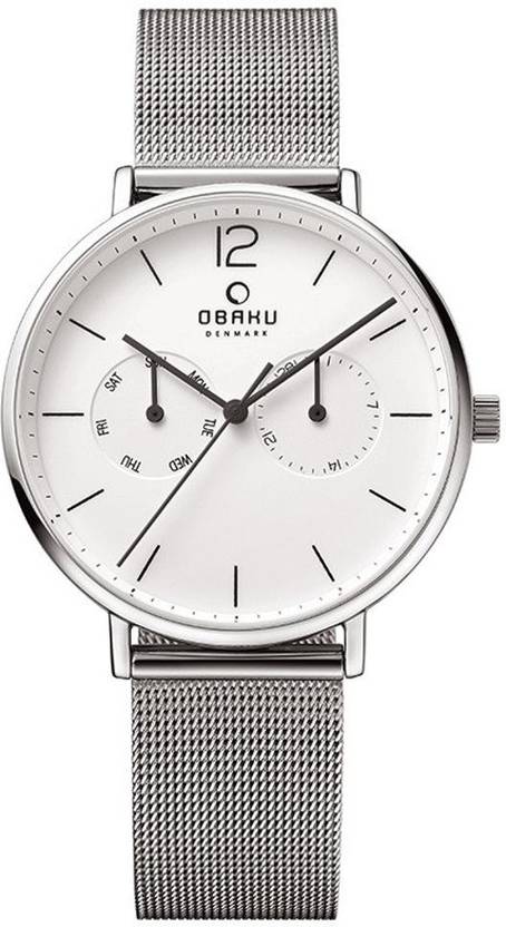 This men's Obaku watch has a stainless steel case and is fitted with a quartz movement. It is fastened with a silver metal bracelet and has a white dial. The watch has a date function.