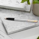 पार्कर फ्रंटियर स्टेनलेस स्टील गोल्ड ट्रिम रोलर बॉल पेन