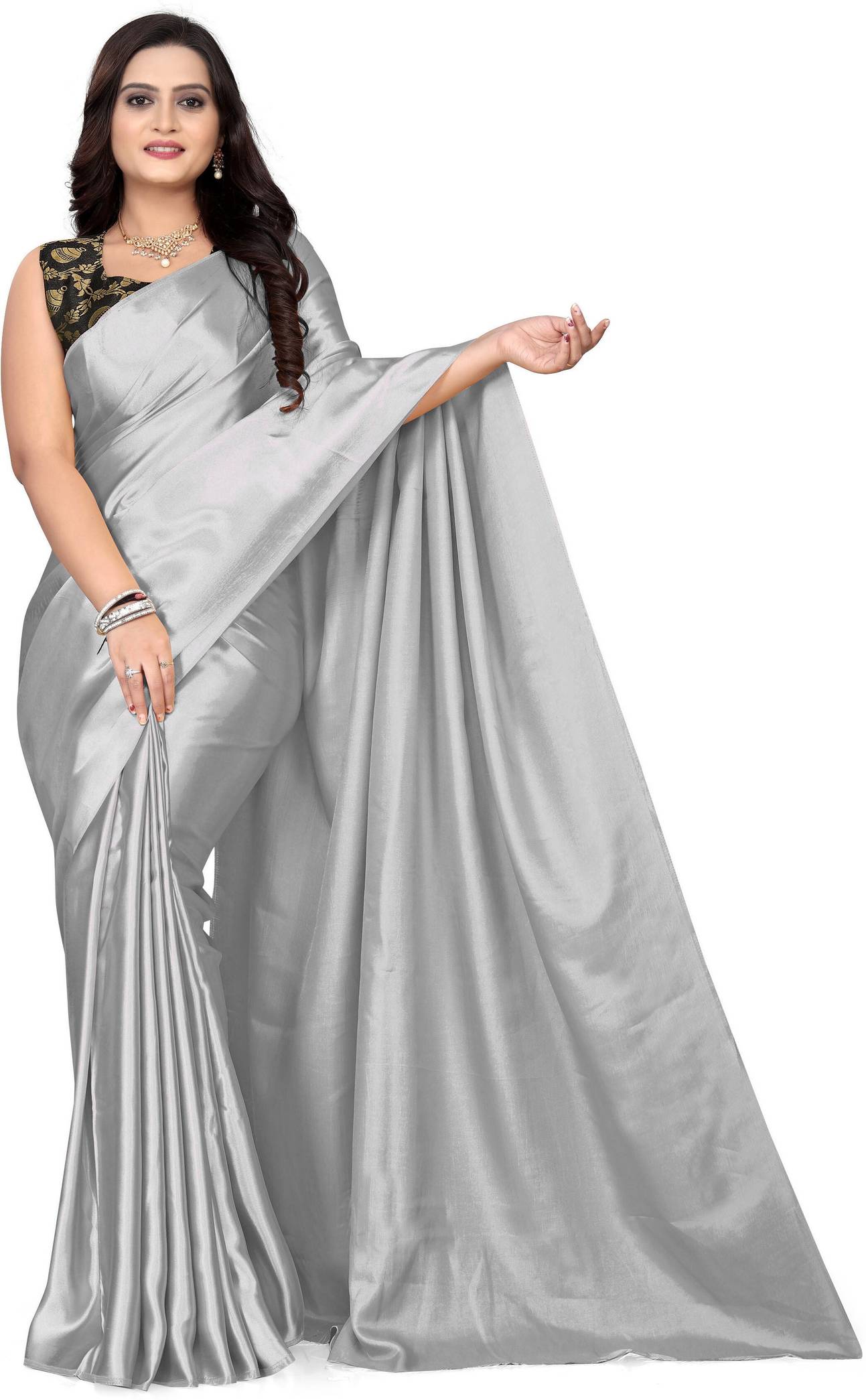 PCDESIGNER सॉलिड/प्लेन बॉलीवुड साटन साड़ी (ग्रे)