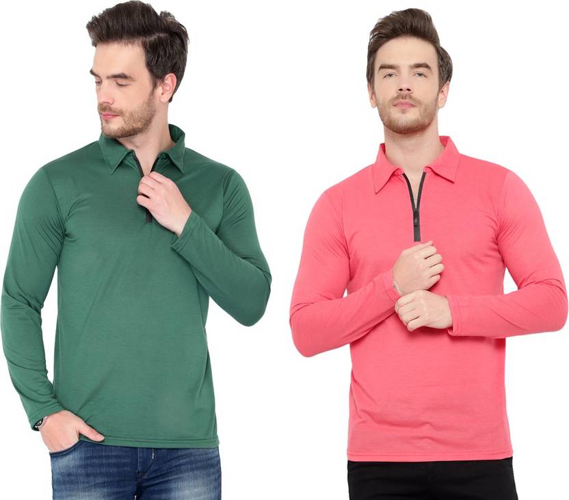 Pack of 2 Men Solid Polo Neck Cotton Blend Dark Green, Pink T-Shirt