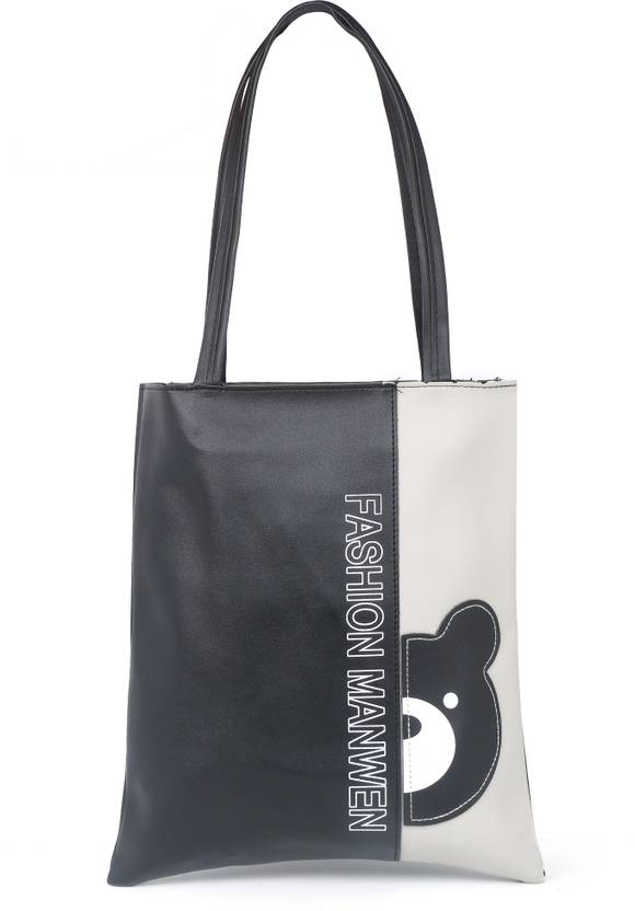 काला लड़कियाँ टॉट - Medium Tote Bag for kids Two tone Bag with Teddy Bear face Printed Design faux Leather