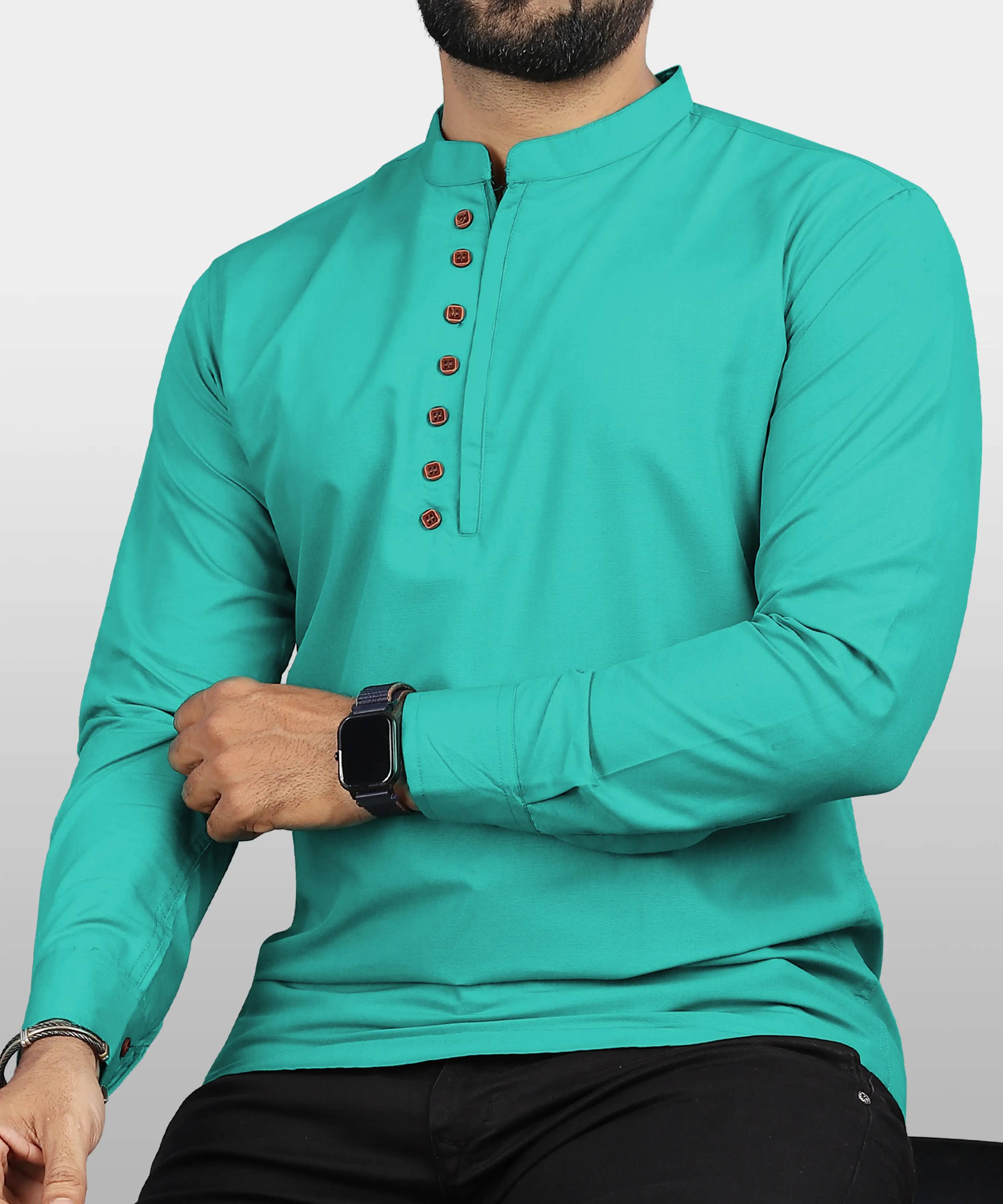 Men’s Casual Short Kurta Shirt with Mandarin Collar & Wooden Buttons