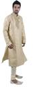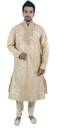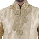 Orange-coloured woven kurta, has a mandarin collar, long sleeves with contrast embroidered taping ialong the hems, a contrast embroidered panel on the collar that extends to the front, a concealed short button placket on the front, an insert pocket on both the sides of the waist, side slits, and woven design throughout. Cream-coloured woven churidar, has a waistband with a drawstring fastening on the front, tapered legs.