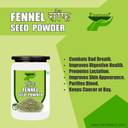 It is commonly used as a spice in cooking, especially in Indian cuisine, where it adds a sweet, licorice-like flavor to dishes. Fennel seed powder is also used for its medicinal properties and is believed to aid digestion, reduce bloating, and freshen breath. It can be added to a variety of dishes, such as curries, soups, and stews, or used as a seasoning for meats and vegetables.