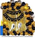 Happy Birthday Banner, 2 PC Gold Curtain, 50 PCS Gold and Black metallic balloons, 3 PC Confetti, 2 PC Gold star, 1 PC Balloon Pump, 1 PC Arch, 1 PC Glue Dot