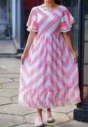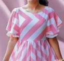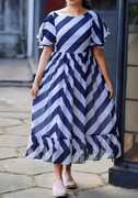 This dress features a bold, diagonal stripe pattern in alternating navy blue and white, creating a striking geometric design. It has a round neckline and short, ruffled sleeves that add a playful touch to the otherwise structured look. The dress has a fitted bodice with a defined waistline, flowing into a voluminous, A-line skirt that falls below the knee, ending in a subtle ruffled hem. The fabric appears to be light and flowy, ideal for casual or semi-formal events. The dress is paired with simple, comfortable shoes, giving it a relaxed yet stylish vibe.