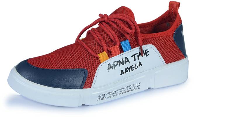 Shoebook red sneaker shoes for boys net synthetic on upper flexiable airmix sole, Padded insole, Apna time aayega print on side upper, Snugfit comfort and looks cool in your feet.