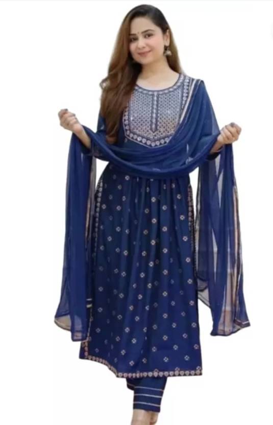 beauriful jaipuri printed nyra cut kurti with pant and dupatta with zari embroidery work