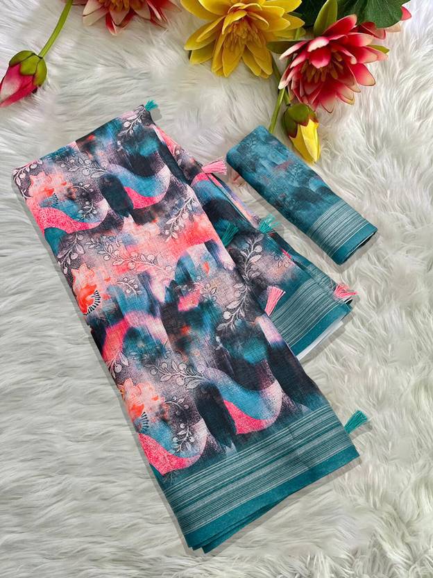 This Beautiful Women’s Digital Premium Printed Linen Abstract Saree Fabricated With 100% Cotton Linen Is Sure To Keep You Comfortable In Summers ,Winters,Monsoon,The Saree Comes With Blouse Piece.