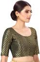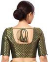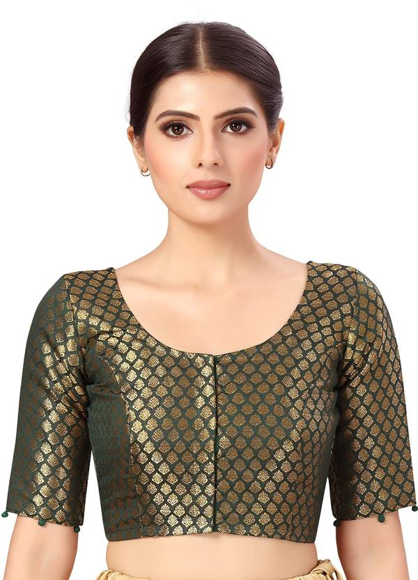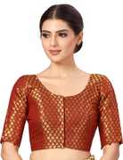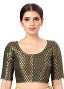 A beautiful Benaras brocade blouse from STUDIO Shringaar. This blouse is lined with pure cotton and hence very comfortable. The sleeves are short and it opens from the front with hook and eye. This blouse has a round neck in the front and the back. It is a very festive blouse and can be teamend with any silk saree. The design inside is golden in colour. There are ample margins on both sides and hence the blouse can be made bigger by an inch or 2 if needed. There are tassels at the back. This blouse is non padded and is availble in 6 colours and many sizes.