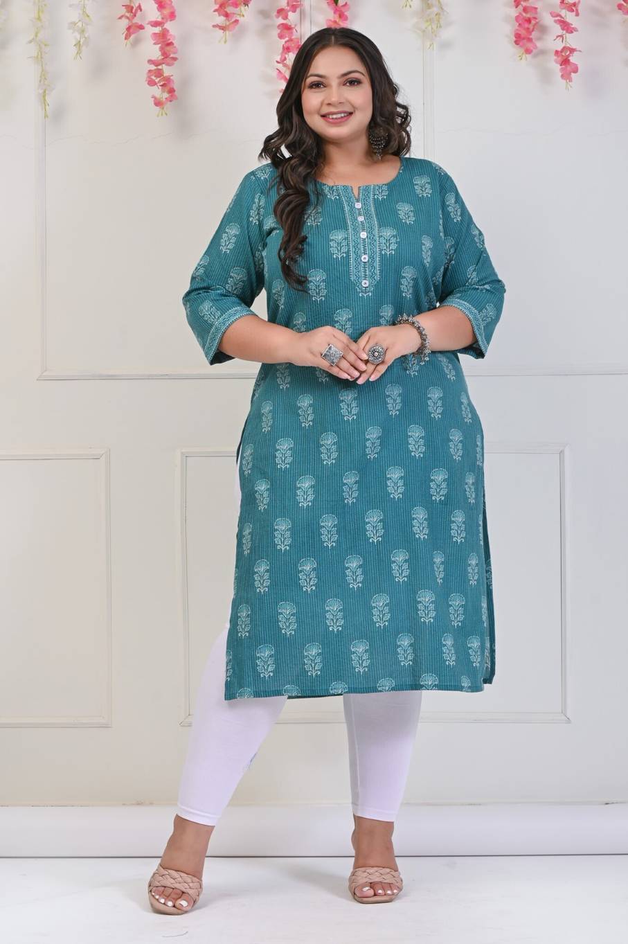 The Swasti Plus Size Women's Straight Beautiful Floral Print Cotton Kurta is a stunning garment designed for style and comfort. Made from high-quality cotton fabric, it is tailored to suit the needs of plus-size women. The kurta features a straight silhouette that flatters the body shape and offers a relaxed fit. Adorned with a vibrant floral print, it adds a touch of femininity and elegance to any outfit. The soft and breathable cotton material ensures all-day comfort, making it perfect for casual or semi-formal occasions. With its beautiful design and inclusive sizing, this kurta is a must-have addition to any plus-size woman's wardrobe.