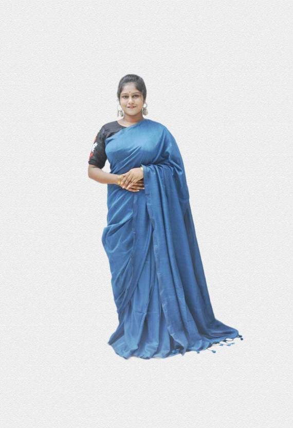 Solid/Plain Handloom Cotton Blend Saree (Blue)