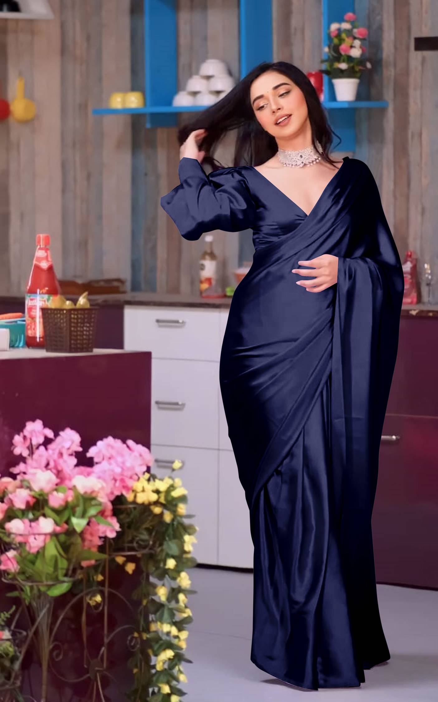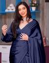 TIMEERAA सॉलिड/प्लेन बॉलीवुड साटन साड़ी (गहरा नीला)