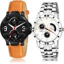 Dial Colour : Black And Silver ; Band Colour : Orange And Silver ; Case Shape : Round ; Band Material : Genuine Leather And Stainless Steel ; Case Diameter : 44 And 45 mm ; TIMENTER Treading Wrist professional and chain watch Orange And Silver Colour Analog Genuine Leather And Stainless Steel Belt 2 Watch Combo For Boys And Men - S528-B85