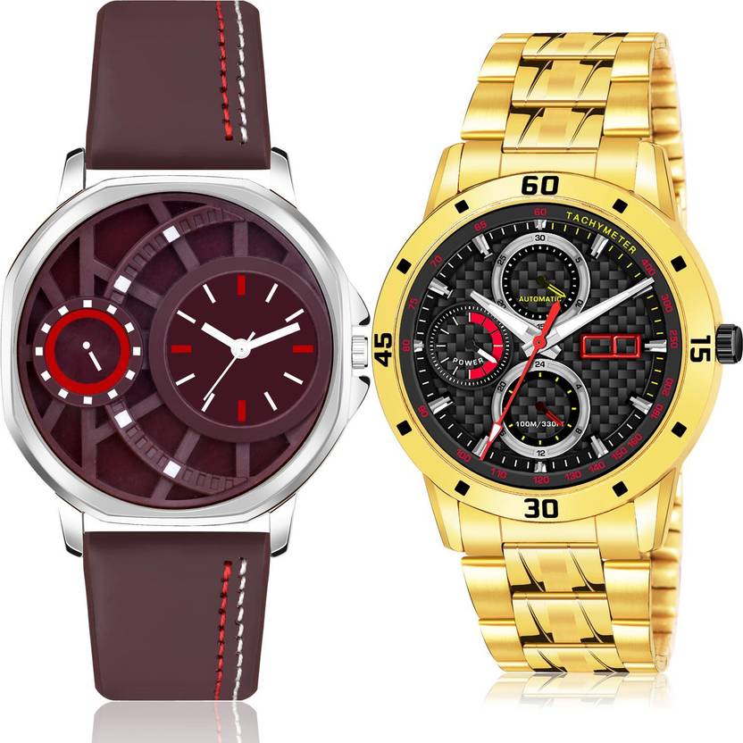 Dial Colour : Red And Black ; Band Colour : Red And Gold ; Case Shape : Square And Round ; Band Material : Genuine Leather And Stainless Steel ; Case Diameter : 43 mm ; TIMETRANSELEVATE Modern Luxury casual chronograph dial and gold chain Red And Gold Colour Analog Genuine Leather And Stainless Steel Belt 2 Watch Combo For Men - BM46-(60-S-21)