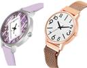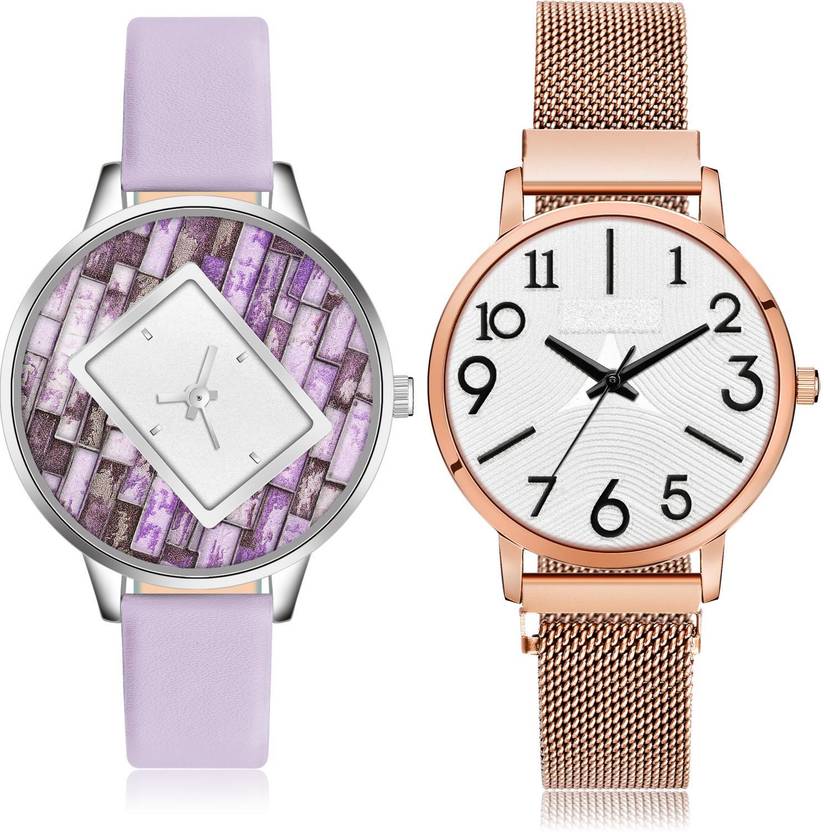 Dial Colour : Purple And White ; Band Colour : Purple And Rose Gold ; Case Shape : Round ; Band Material : Genuine Leather And Metal ; Case Diameter : 36 And 33 mm ; TIMETRANSELEVATE Treading Chronograph professional genuine leather And magnet chain Purple And Rose Gold Colour Analog-Digital Genuine Leather And Metal Belt 2 Watch Combo For Women And Girls - GM568-GM243