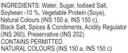 WATER, SUGAR, SALT, NATURAL COLOUR, SOYABEANS, BLACK SALT, SPICES AND CONDIMENTS, ACIDITY REGULATOR, PRESERVATIVE