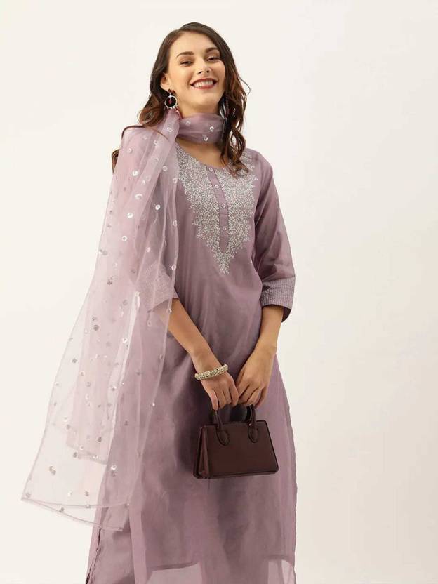 Kurta Length : 44 inch, Kurta Sleeve Length : 16 Inch, Bottom Length : 36 inch With Half Elastic, Stitching Type : Stitched, Work : Embroidery, Solid, Mauve embroidered Kurta with Trousers with dupatta, It has a lightweight texture and is very breathable on the skin.Product Color May Slightly Vary Due To Photographic Lighting Sources Or Your Monitor Settings