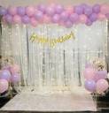 Birthday decoration combo set includes a variety of items designed to create a festive and celebratory for a birthday party. The set include items such as Purple and Pink Balloon, birthday banners, Net curtain, Light, Balloon Arch and balloon Glue, Hook, Ribbon.