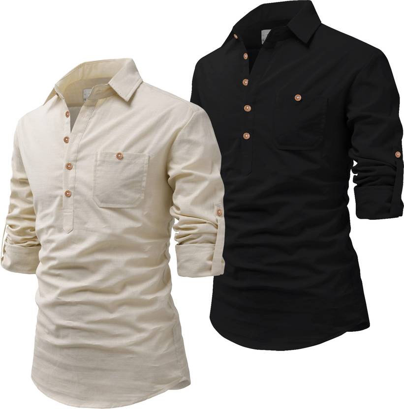 🌟 Elevate Your Style with Versatile Elegance! Introducing the Univibe Men's Cotton Kurta Pack of 2 in a sophisticated solid pattern. The Comon Black base, coupled with accent colors like Grey, Maroon, Orange, and more, ensures a wardrobe essential for every occasion. 👔 Design & Fit: Pattern: Solid Color: Comon Black with a spectrum of vibrant tones Closure: Button Weight: Lightweight Fabric: Crafted from Durable Luster Venture Cotton for a sleek finish Collar: Shirt Collar Length & Sleeves: Regular length, Curved Hemline, and Full Sleeves 🌈 Versatile Style Options: Embrace the possibilities! Pair these kurtas with denim for casual flair or dress it up with tailored trousers for a refined look. The pack of 2 offers endless styling combinations. 🧼 Material & Care: Machine wash with like colors Cold water wash Dry in shade Tumble dry low Iron on the reverse side for lasting elegance 👖 How to Style: For a casual vibe, pair with denim and sneakers. Elevate the look with tailored trousers and loafers for a more polished appearance. The options are endless—express your style!