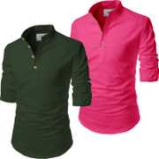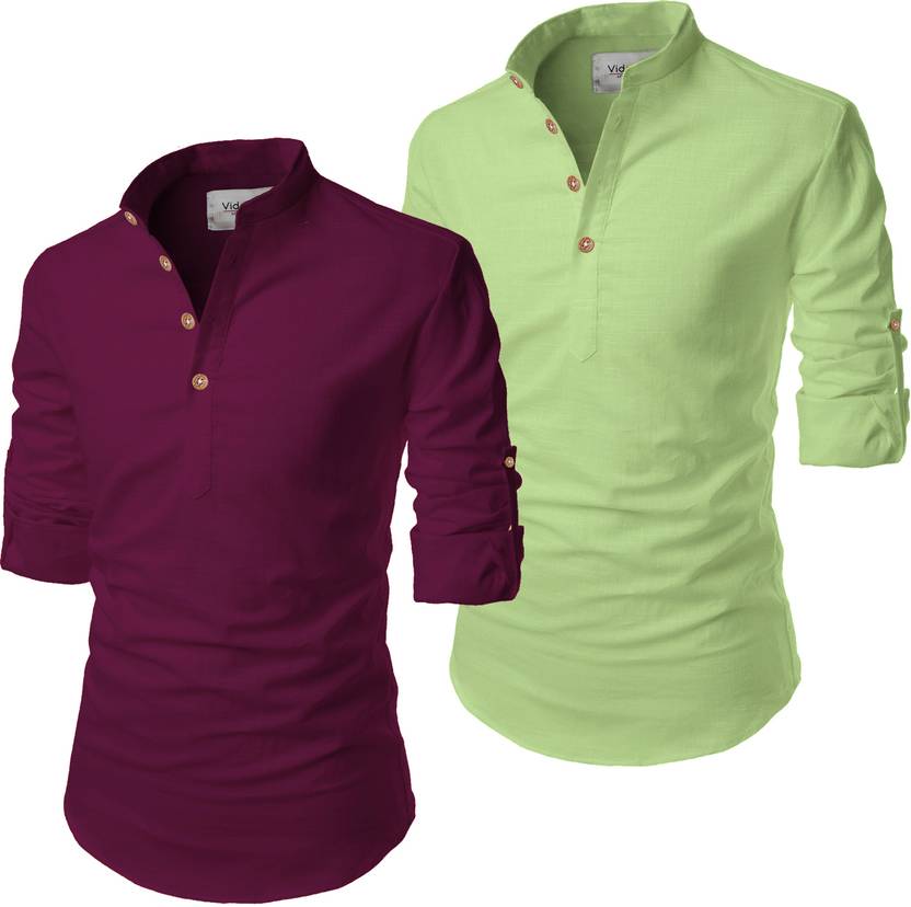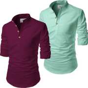 Pack of 2 Men Solid Cotton Blend Straight Kurta (Light Green, Purple)