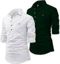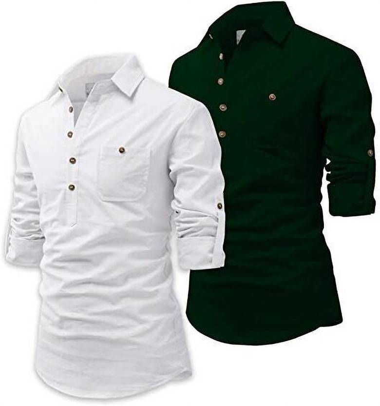 Men Solid Cotton Blend Straight Kurta (Green, White)