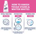 सफेद कपड़े अक्सर अपनी चमक खो देते हैं और समय के साथ डल हो जाते हैं। जब सफेद कपड़ों की बात आती है, तो कठिन दागों को हटाना और धोने के बाद उन्हें नए धोने की तरह चमकते रहना एक चुनौती है। वैनिश क्रिस्टल सफेद आपके सफेद कपड़ों को 50 बार धोने के बाद भी नए जैसा चमक देता है। इसका क्लोरीन ब्लीच फ्री ऑक्सी एक्शन ब्राइटर सफेद्स देता है और डैमेज हुए बिना टफ स्टेन्स को हटाता है।
