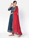 वीबायज़ महिलाओं की प्रिंटेड और गोटा पट्टी अनारकली कॉटन डार्क एक्वा कुर्ता पैंट और दुपट्टा के साथ राउंड नेक, 3/4 स्लीव, प्रिंटेड और गोटा पट्टी, फ्लेयर्ड हेम, नो स्लीव है। यह आपको पार्टी वियर लुक के लिए आरामदायक बनाए रखेगा। इसे हाई हील्स के साथ पेयर करें और आसानी से चिक और फैशनेबल दिखें।