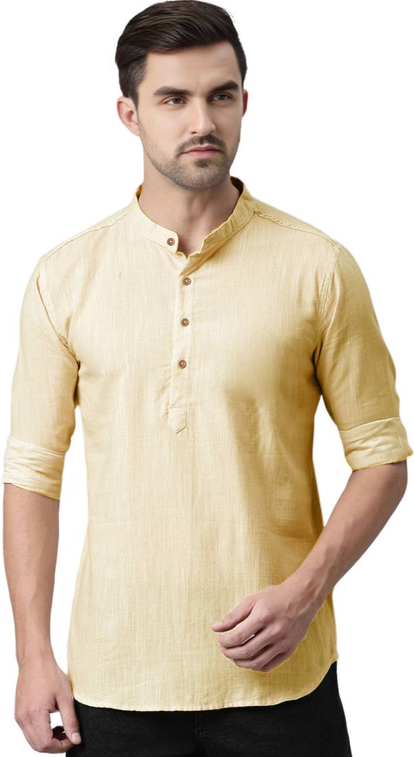 This pure cotton beige short kurta is perfect for men who value style and comfort. Its versatile design makes it ideal for any occasion—festivals, parties, or casual outings. Product Details 📋 👨‍🦰 Gender: Men 🎨 Pattern: Solid 🧵 Design Type: Plain 🔘 Closure: Button 👕 Sleeve: Full Sleeve (Roll-Up Option) ⬆️ Waist Rise: Mid-Rise 🪡 Collar: Mandarin/Chinese ✂️ Hemline: Curved 🌿 Fabric: Pure Cotton 📏 Product Length: Short 📦 Pack of: 1 Material & Care 🧺 Fabric: 100% Cotton Wash: Suitable for hand wash and machine wash. How to Style 🎯 Pair it with dark-wash denim or linen trousers for a casual look. Dress it up with a pair of churidar or slim-fit pants for festive occasions. Add leather sandals or loafers and a wristwatch for a classy finish. Roll up the sleeves for a relaxed vibe during daytime events. This short kurta seamlessly blends traditional elegance with modern styling, making it a wardrobe essential for every man! 👌"