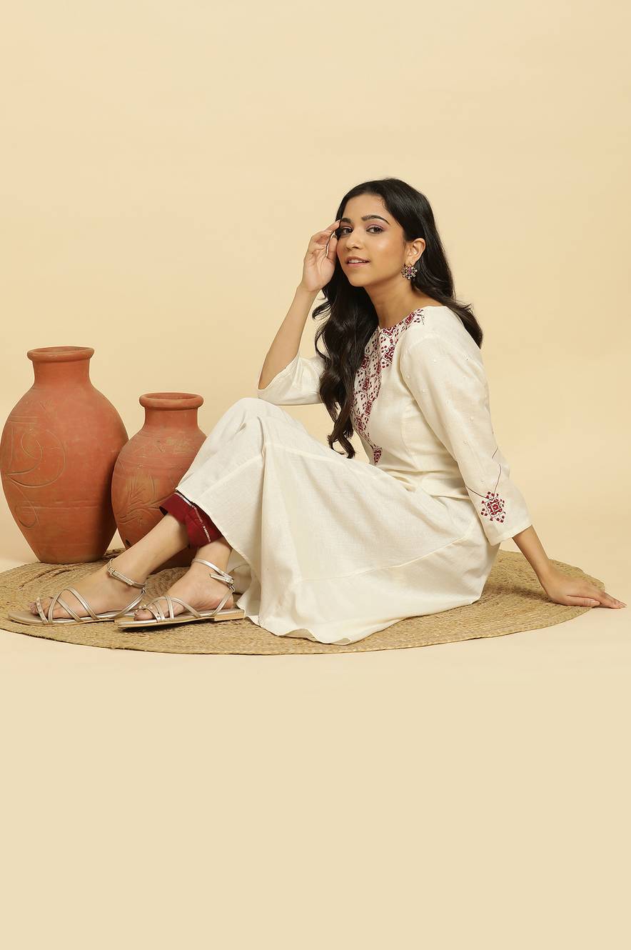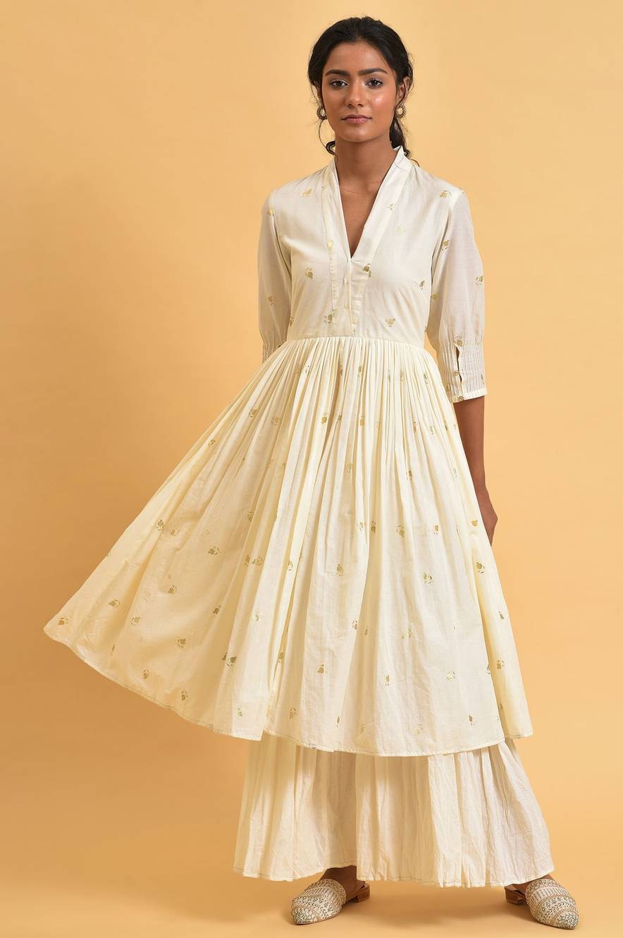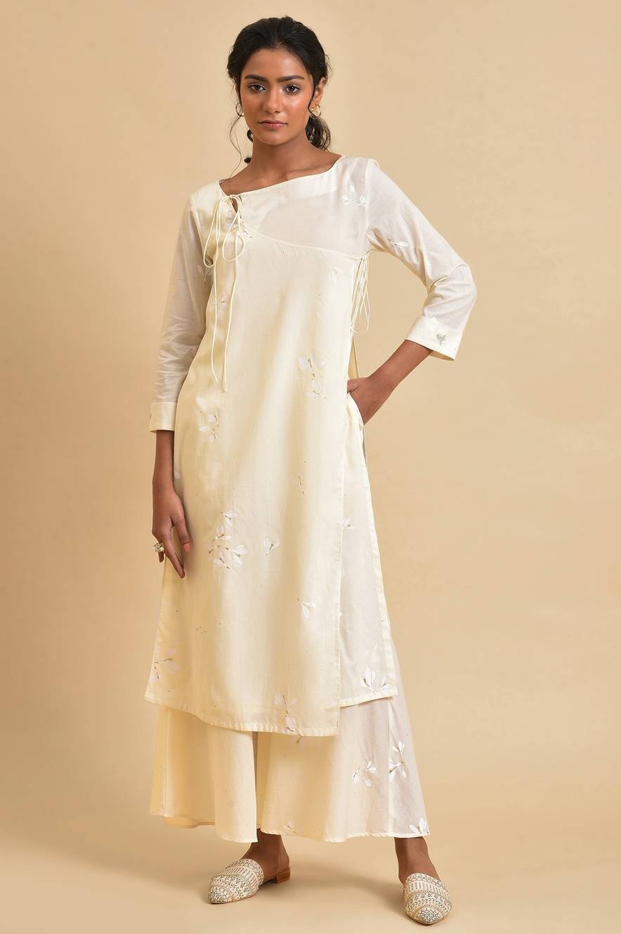 Floral print ecru dual wrap angrakha kurta which is paired with circle flare pants.