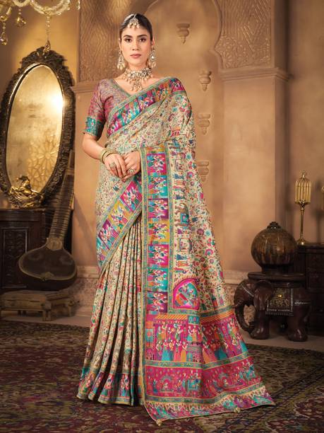 Woven, Digital Print Madhubani Pure Silk, Jacquard Sare...