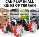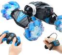 This RC transformable stunt car takes RC fun to a whole new level with gesture sensing, sweet music, and colorful lights! On-road or off-road, the huge wheels keep the car's body not be hit for off road handling and blazing speed. The powerful 3.7V 1200mAh battery helps the car reach a longer working time up to 40 minutes, perfectly satisfy your playing needs. Amazing! Enjoy every thrilling driving moment. Product Details:- Material: ABS and metal Control: Remote control + gesture control time after full charge: Up to 45 mins Charging time: 2-3 hours Charging interface: USB Remote control distance: Up to 80 m Functions: Drift, climb, twist, forward and retreat, auto demo, 360 rotation, four drivers Suitable for age: 6+ years old Bring more funny to play with the kids! Two Modes of Controlling: One mode is put the watch on your hand and control the stunt car by change your hand gesture, the other is use the remote controller to keep the car driving as you want. This car brings its owner to a new level of rc fun. 2.4GHz Radio System: with anti-jamming capability allows to race at the same time in the same track. 100 meter control distance, racing freely. Transformers Modelling, Colorful Lights and Cheerful Music: this new version RC car will give your kids a childlike, fashionable,special driving experience. Bionic Spines designed in this car make it more fun and convenient, twist transform as you control. Protect the car from Collision crash drop for longer life span. One Key Transform for On Road & Off Road: Transformable body makes the car more flexible and suit for all terrains. Move on grass, sand, rocks, rugged roads and other Terrain. One Key Transform for On-Road & Off-Road: Transformable body makes the car more flexible and suits all terrains. Move on grass, sand, rocks, rugged roads, and other terrains.